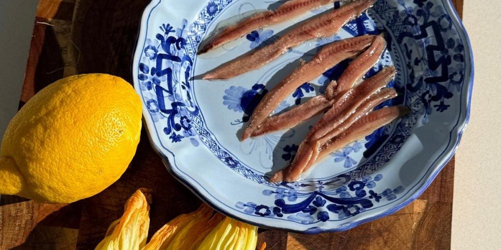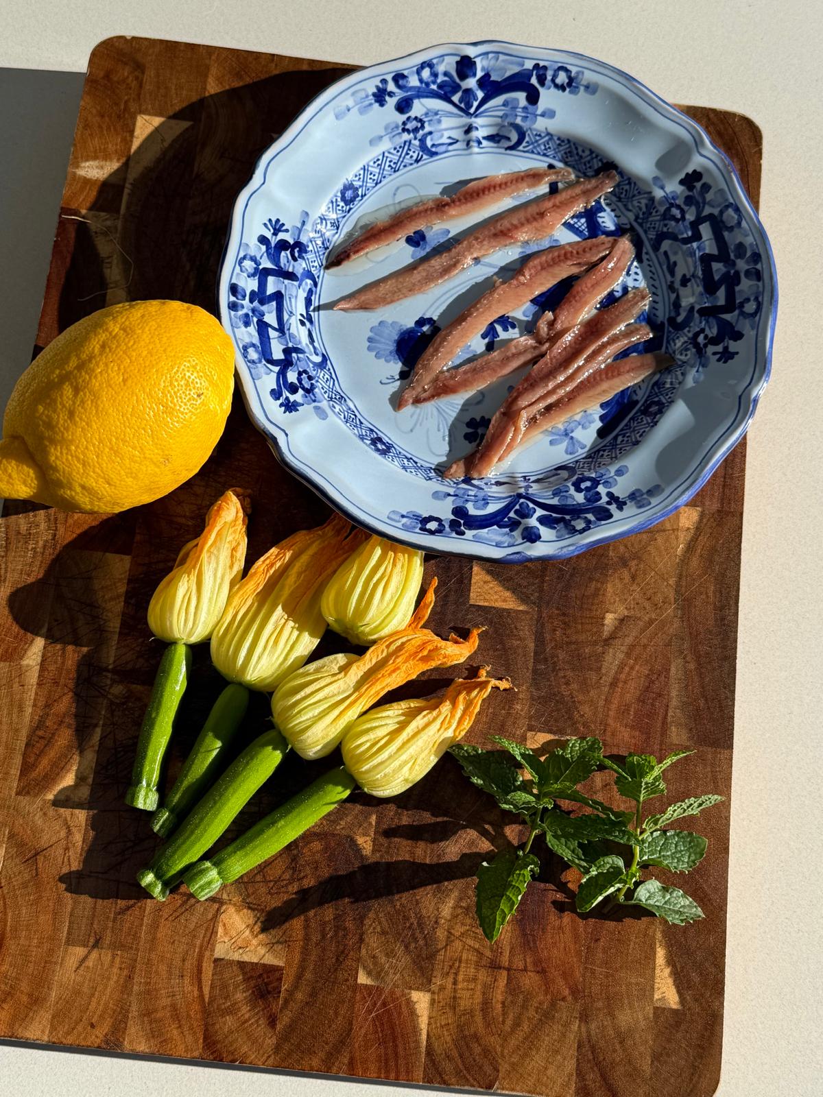 Flores de calabaza rellenas con ricotta, miel y anchoa
