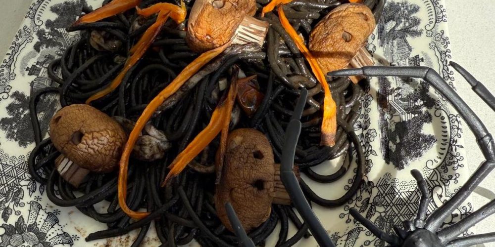 - Montaje spooky: Sirve la pasta en platos hondos. Decora con los champiñones en forma de calaverita y el camote crujiente