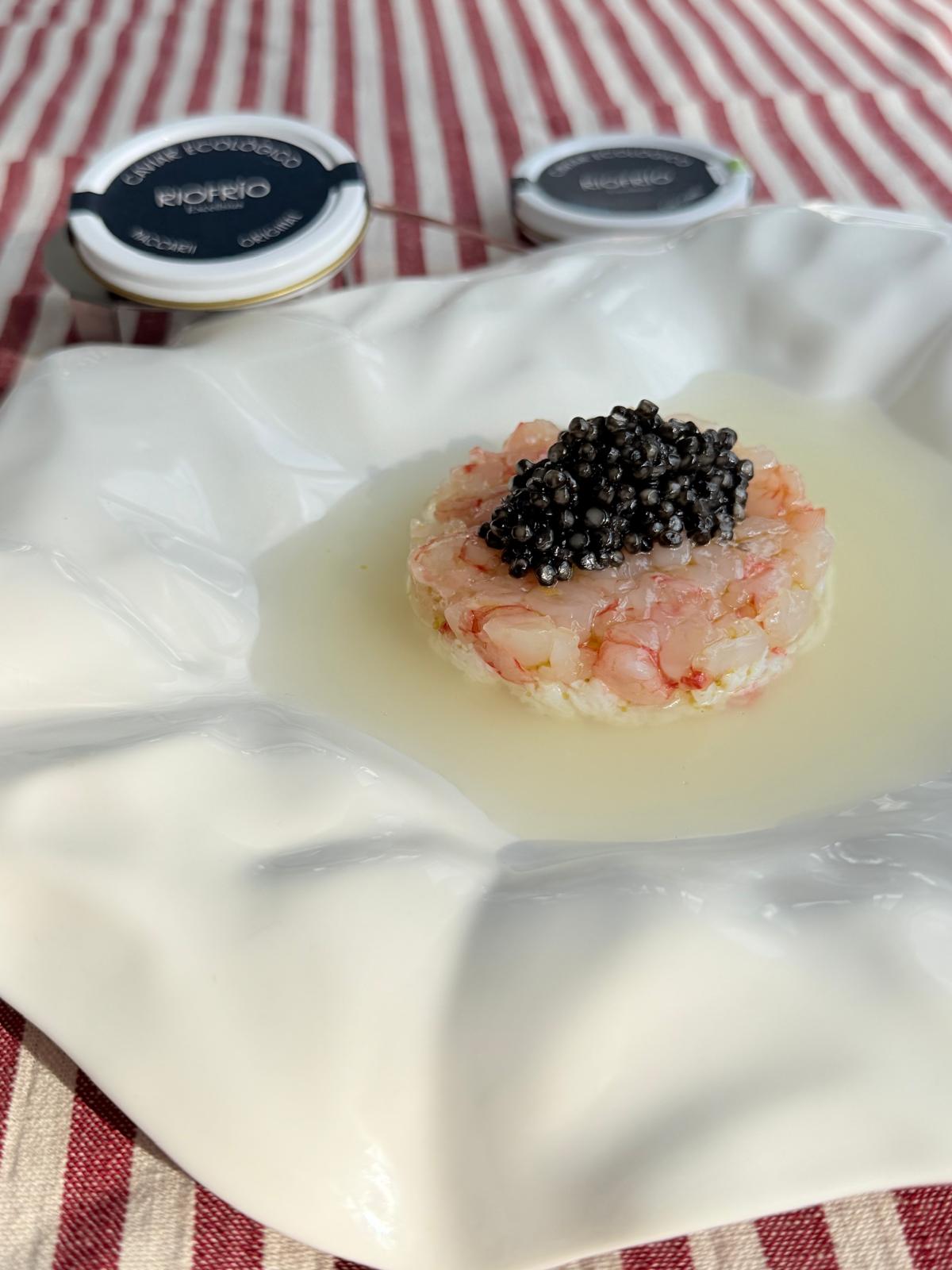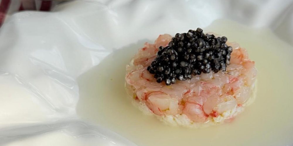 Tartar de gamba roja con cangrejo, fumé blanco ahumado y Caviar Riofrío