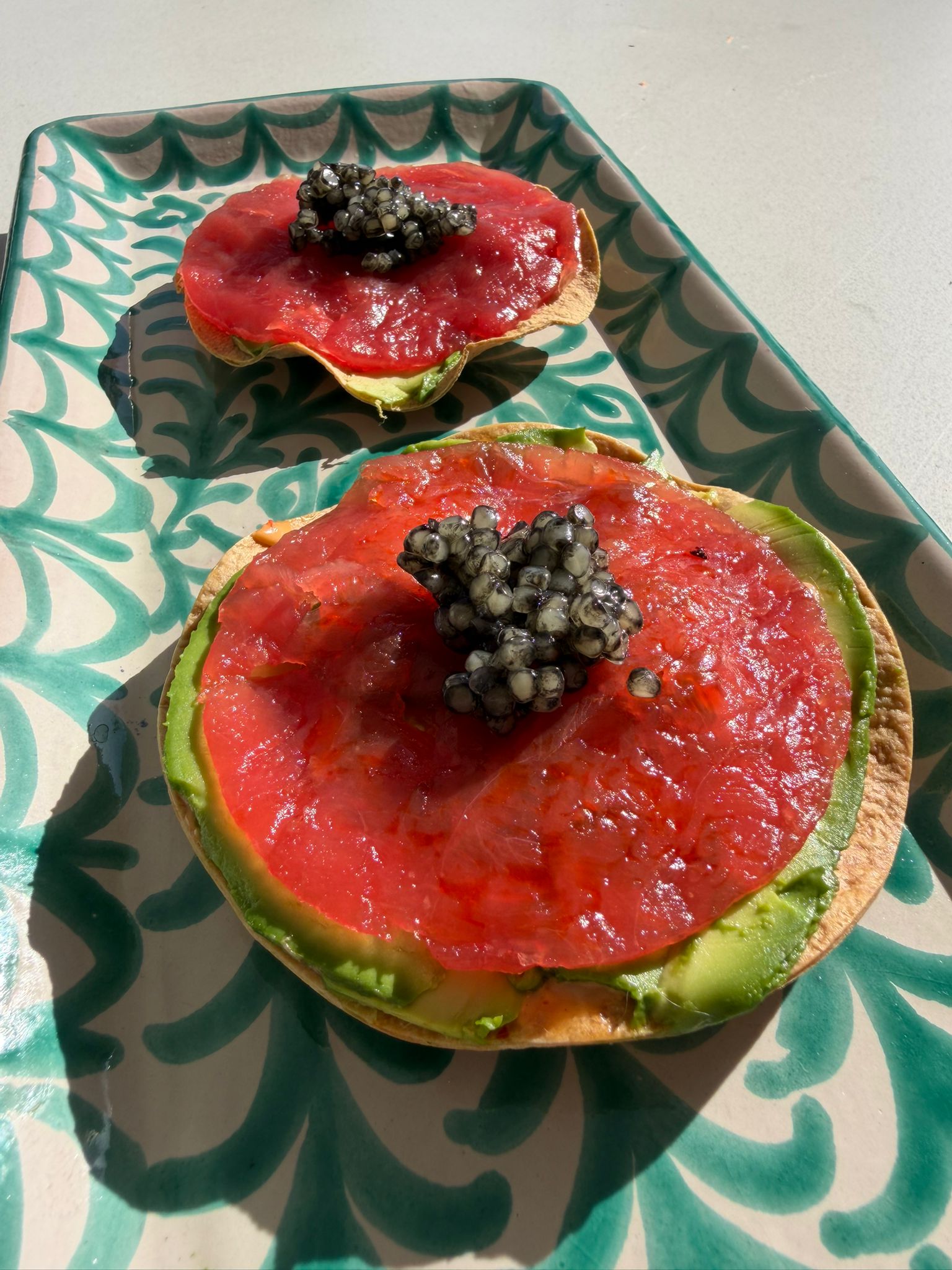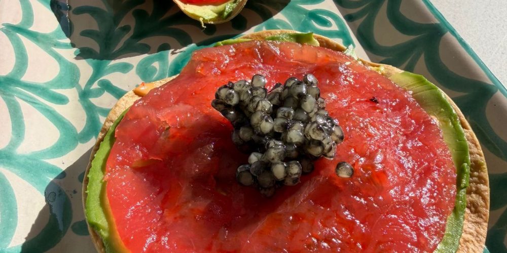 - Montaje: Unta una capa ligera de mayonesa sobre la tostadita. Añade láminas finas de aguacate y un poco de cebollín. Coloca el carpaccio de atún, da una pasada ligera de aceite de chiles y termina con caviar, si decides usarlo.